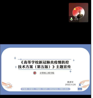 学院行政第二负责人陕晋军作了“《高等学校新冠肺炎疫情防控技术方案(第五版)》主题宣传”的发言。在发言中,陕晋军同志为我们梳理了开学前、返校途中及开学后三个阶段在疫情防控方面需注意的事项,提出学院要全方位做好疫情防控工作,强化责任落实,继续做好线上教学工作,认真开展宣传教育引导,切实增强师生科学防护意识和能力,为开学做好准备。